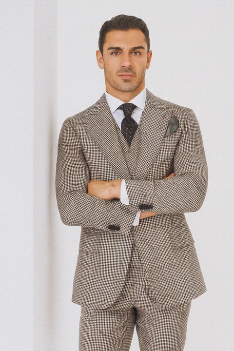 At the heart of this suit is the double-breasted vest, adding depth, texture, and formality to the ensemble. The vest provides not only a nod to tradition but also an added layer of versatility — allowing the wearer to remove the jacket and still maintain a polished, distinguished appearance. The meticulously aligned buttons and structured cut echo the sartorial discipline of the 1930s, when tailoring was an art form and every stitch served a purpose.