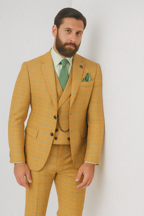 The suit features a precision-tailored blazer, impeccably structured to accentuate the masculine silhouette. Its soft orange plaid fabric is woven with subtle undertones of golden beige and amber, producing a luminous sheen under studio or natural light. The jacket’s notch lapels, double vents, and slim-fit cut ensure a clean, elongating profile, while its fully lined interior enhances comfort throughout long hours of wear. Complementing this artistry is a matching double-breasted waistcoat, finished with a chain accent that echoes timeless vintage allure — a nod to heritage craftsmanship reborn for the modern man.