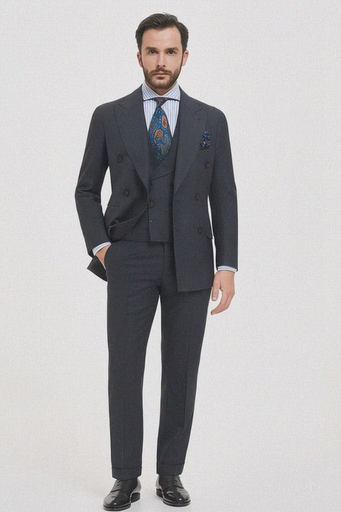 This gray plaid suit is incredibly stylish and sharp. The double-breasted design gives it a classy, confident vibe. The wool fabric feels premium and comfortable all day. Perfect for formal events or special dinners. -Ethan Parker