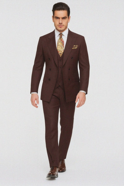 Double Breasted Suits - Vested Suits Wool Fabric - Apolo King Brand - Solid Brown Suit