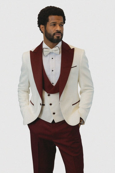 Hilton White and Burgundy Paisley Peak Lapel Tuxedo Jacket with Matching Shawl Vest and Wool Pants – Includes Bow Tie