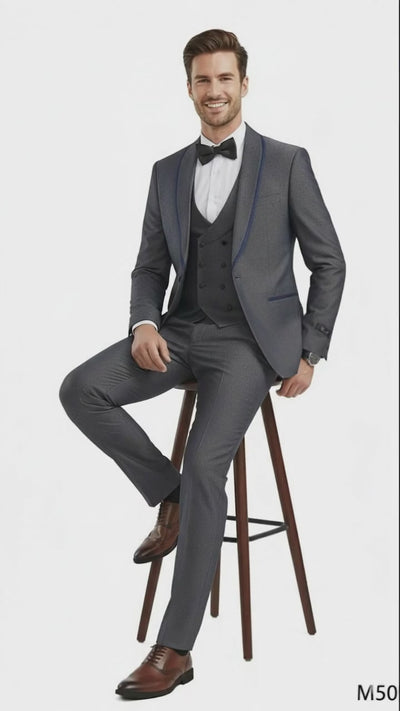 Men’s Charcoal Gray with blue Trim Slim Fit 3-Piece Suit – Modern Wedding and Business Formal Tuxedo Set