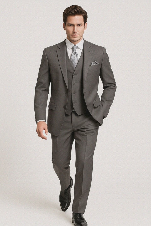 "Charcoal Grey Men's 2-Button Suit with Pleated Pants & Double-Breasted Vest"