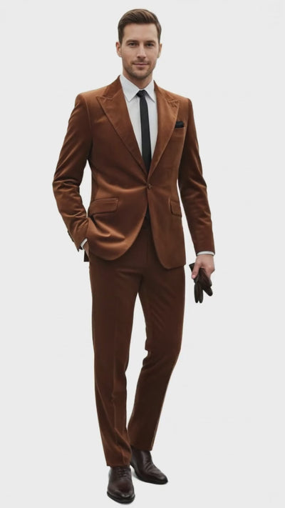 Mens Brown Velvet 2-Piece Suit – Luxury Slim Fit Formal Blazer and Pants Set in Rust Copper Color