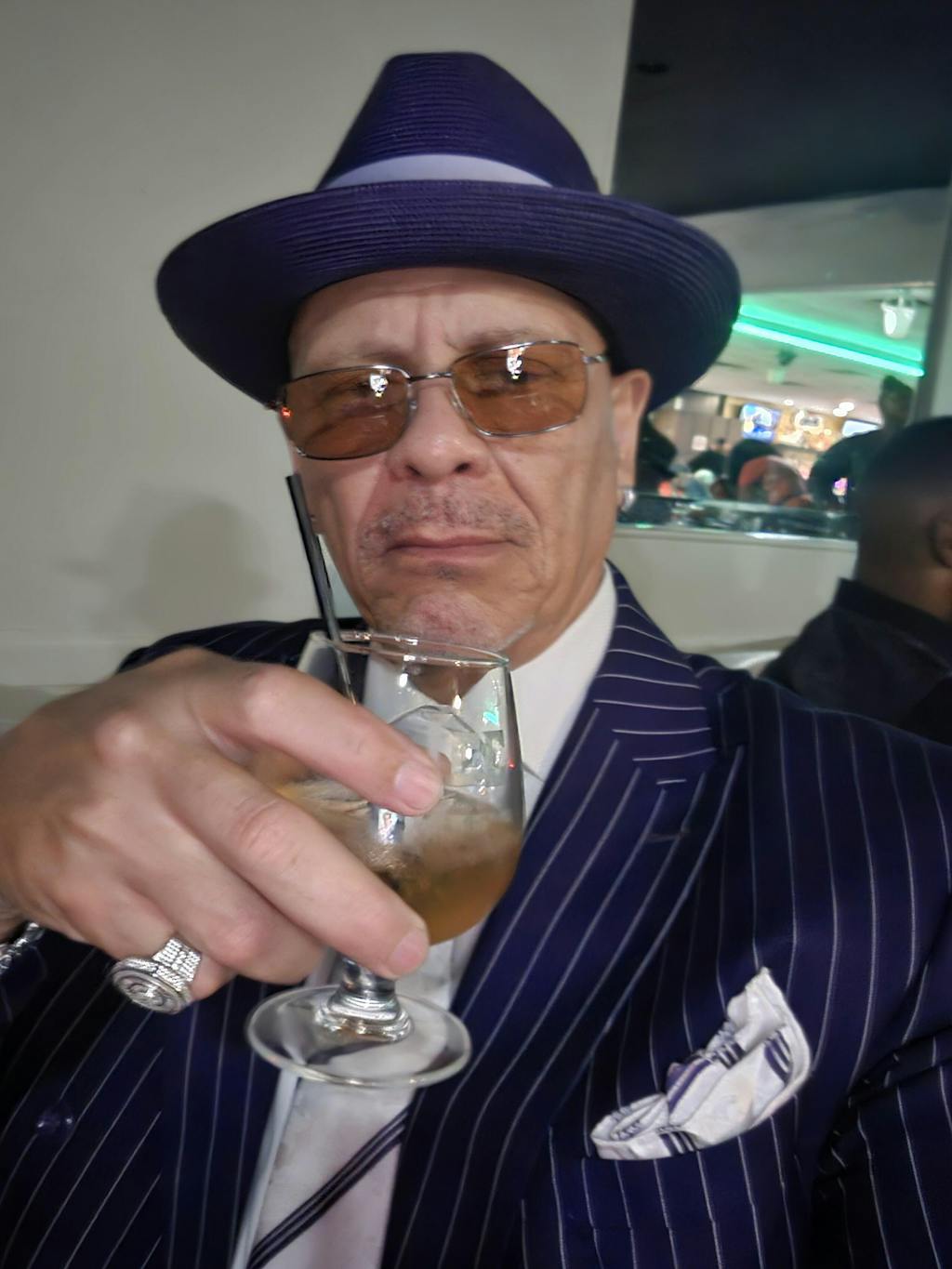 Featuring a striking royal and white pinstripe color combination, this suit instantly commands attention. The vertical pinstripes elongate the silhouette while adding dramatic contrast and visual power. This high-impact colorway is rooted in iconic gangster and pimp-era fashion, symbolizing confidence, success, and unmistakable presence.