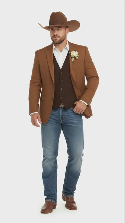 Crafted from high-quality fabric with a smooth texture and structured fit, this blazer delivers both comfort and durability. The rich brown tone complements denim jeans or dress pants, making it a versatile piece for both formal and semi-casual settings. Featuring a notch lapel, single-breasted closure, and precise tailoring, it ensures a sharp, masculine silhouette ideal for any cowboy-inspired look.