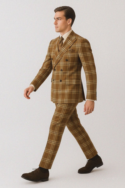 Step into refined sophistication with this Men’s Double Breasted Wool Suit, designed in a striking tan and brown windowpane plaid pattern. Featuring a 6-on-3 double-breasted front and a three-quarter length jacket, this suit blends vintage charm with modern tailoring, making it a standout choice for men who appreciate stylish craftsmanship.
