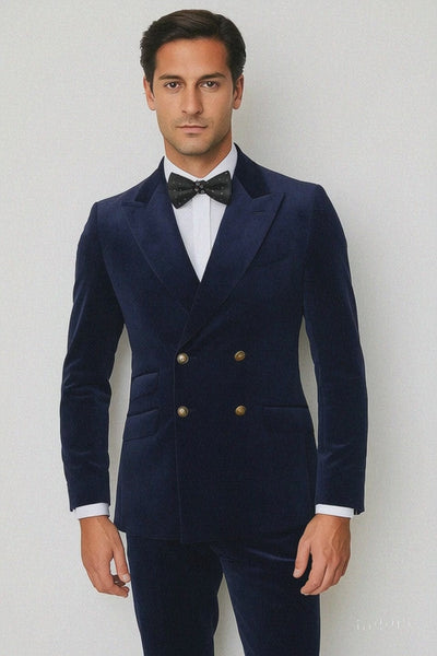Mens Velvet Suit - Slim Fit Double Breasted Suit - Blazer and Pants R-Blue