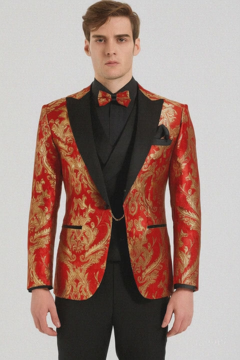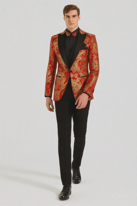 The Red Gold Modern Fit 3-Piece Suit with Matching Bow Tie is perfect for men who want to embody sophistication, boldness, and luxury at weddings, formal parties, and cultural celebrations.