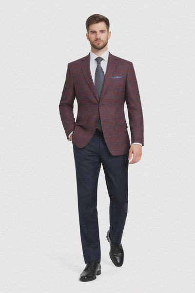 The rich burgundy base combined with an elegant blue windowpane plaid pattern creates a striking yet balanced look that stands out without being overpowering. This timeless plaid design adds dimension and texture, making it easy to pair with solid dress shirts, turtlenecks, or lightweight knitwear. The slim fit cut enhances the natural silhouette, offering a tailored, modern profile that flatters the chest and shoulders while tapering cleanly through the waist. Designed with a classic two-button front closure, this sport coat delivers versatility and effortless styling for both professional and smart-casual settings.