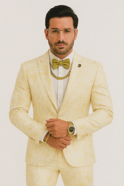 White and Gold Suit or Ivory - Gold Tuxedo Suit Matching Bowtie paisley pattern suit